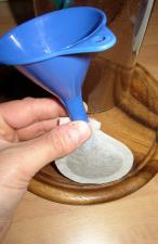 Nun ist der Zeitpunkt gekommen, um Kaffee mithilfe des Trichters in den Rohling bzw. in das Pad einzufüllen. Das Pad ist für eine Tasse gedacht, Sie sollten maximal 8 Gramm einfüllen. Sie werden mehr Kaffee benötigen als in einer konventionellen Kaffeemaschine, was aufgrund des schnelleren Brühvorgangs aber normal ist. Das Pad sollte eine gewisse “Dicke” haben, damit es wie ein Originalpad zwischen Pad-Halterung und Wasserzulauf paßt. Experimentieren Sie etwas und orientieren Sie sich dabei an Originalpads. Sehen Sie? Der Rohling sieht schon fast wie ein Kaffeepad aus, oder nicht?